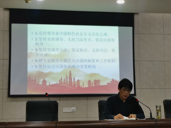 陈爱军带领全体人员集中学习了《习近平法治思想学习纲要》第一章、第二章,他指出,习近平法治思想是在新时代全面依法治国的时代背景和实践条件下创立并不断发展的,是当今时代最鲜活的马克思主义法治理论。这两章主要讲述了坚持党对全面依法治国的领导,以及全面依法治国的根本立场是坚持以人民为中心,各单位要把深入学习《纲要》与深入学习贯彻党的十九届六中全会精神紧密结合起来,全面系统学习、完整准确理解习近平法治思想,始终坚持以习近平法治思想为指引,用习近平法治思想来引领、指导学校工作,不断深化法治校园、平安校园建设。
