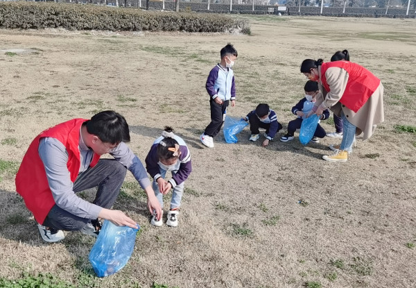孩子们与身穿红马甲,手持垃圾袋的家长志愿者们沿着七星湖畔,从草丛中、石缝里捡拾各种纸屑、烟头、饮料瓶等生活垃圾,将其分类装好,共同美化河边环境。
